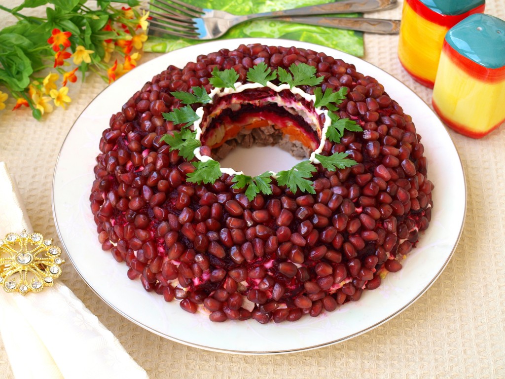 Салат "Гранатовый браслет" с говядиной - вкуснейший многослойный праздничный салат. В этом блюде, как правило, 2 мясных слоя, что делает его особенно сытным и привлекательным для сильной половины, а украшение салата гранатовыми зёрнами не оставляет равнодушными прекрасную половину.