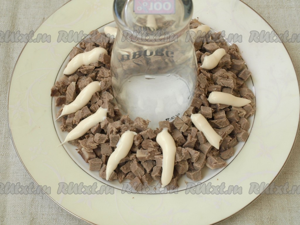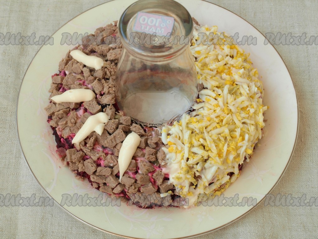 Повторить мясной слой, смазать его майонезом и покрыть натёртыми на тёрке яйцами.