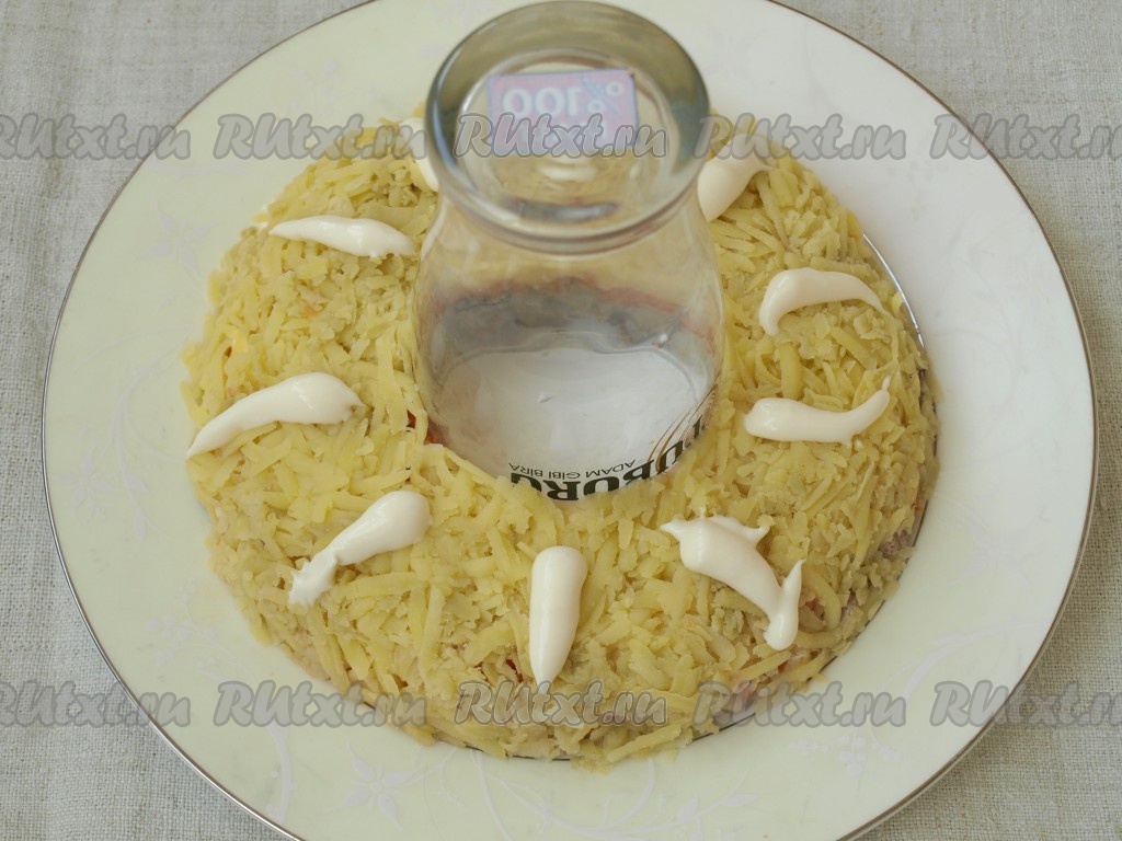 Картофель также натереть на тёрке, выложить поверх морковного слоя. Смазать майонезом.