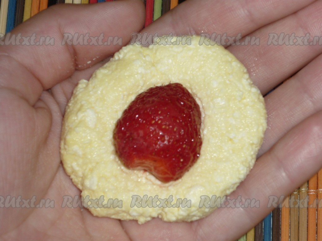 Клубнику моем, удаляя чашелистики, обсушиваем ягоды. Если ягоды крупные, их можно разрезать на 2 части. По истечении 2 часов берём понемногу творожную массу, разминаем в лепёшку, в середину кладём клубничку и защипываем края. Получается круглый ленивый вареник с клубникой внутри. Аналогично формируем все вареники.