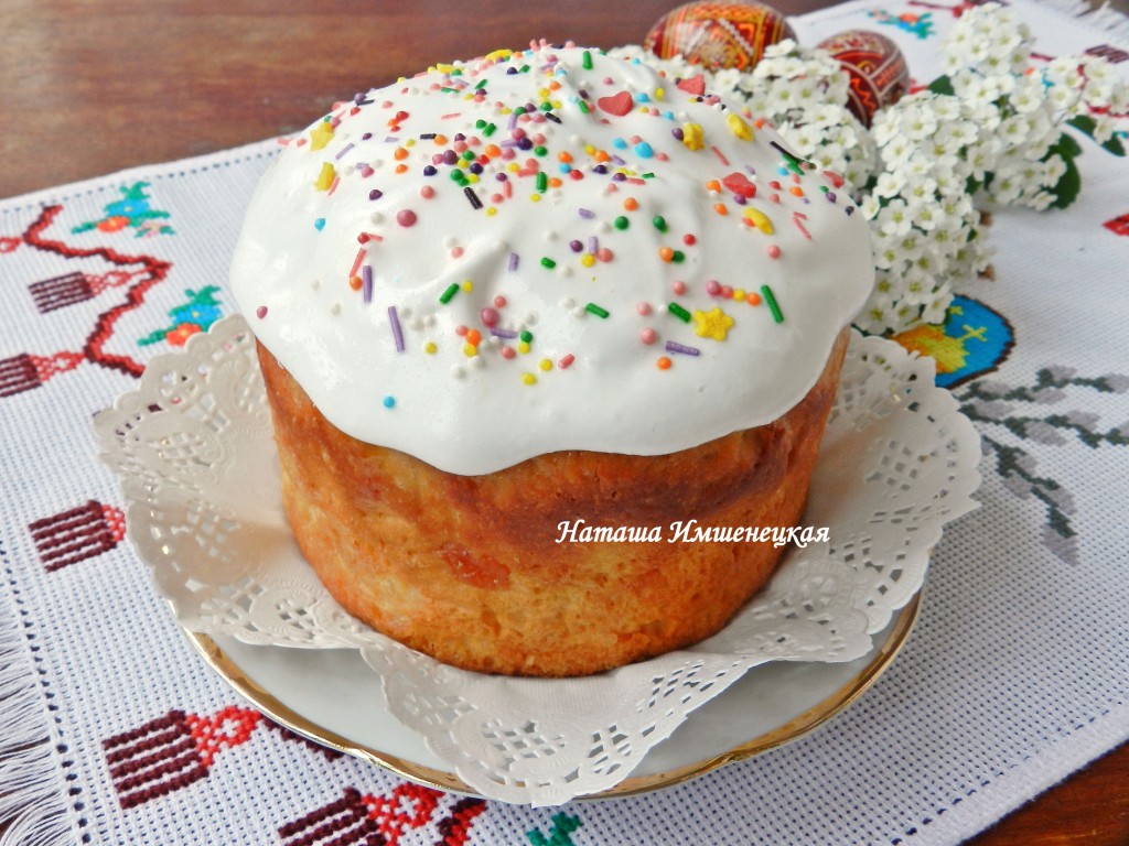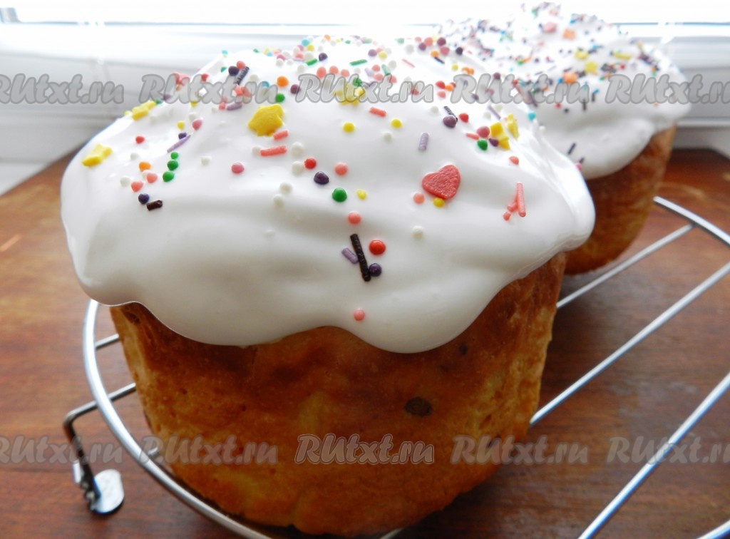 Горячие куличи переложить на решётку, украсить глазурью и посыпать сахарной посыпкой.