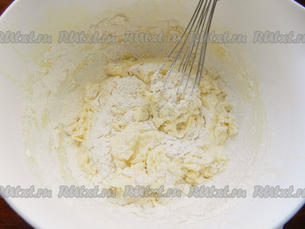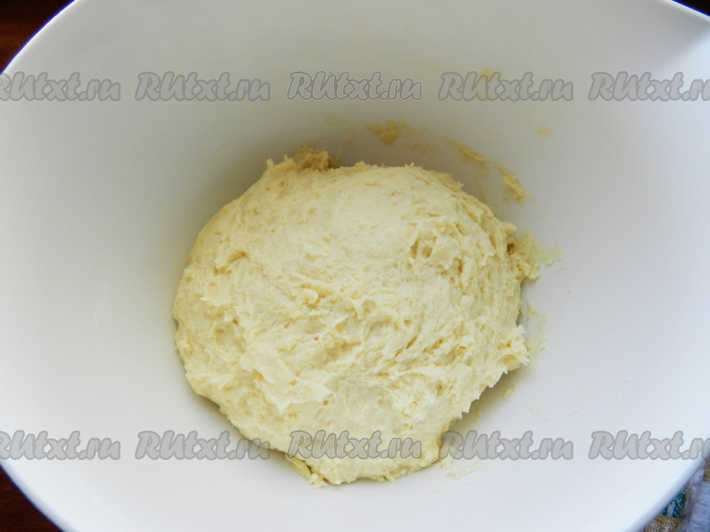 Подсыпая понемногу муку и хорошо вмешивая её, замесить мягкое, липкое тесто. Накрыть миску с тестом полотенцем и убрать для подхода в тёплое место на 1 час (до увеличения в объёме раза в 2).