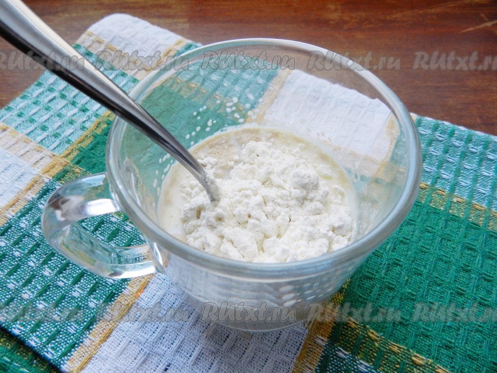 В тёплом молоке (температура молока должна быть примерно 38-40 градусов) растворить 1 чайную ложку сахара и дрожжи. Добавить 1 столовую ложку муки, перемешать, убрать опару в тёплое место на 20-25 минут.