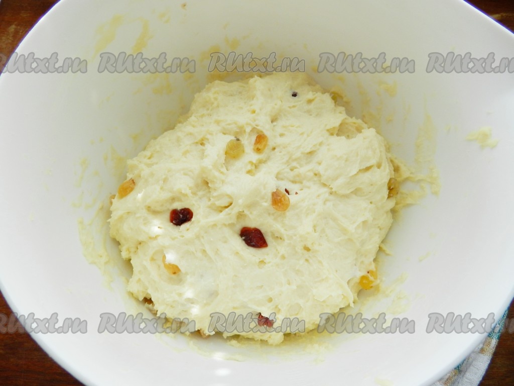 Изюм и клюкву промыть, залить горячей водой и оставить на 10 минут. Затем воду слить, ягоды обсушить, разложив их на бумажном полотенце. Поднявшееся тесто обмять, вмешать в него изюм и клюкву и снова поставить в тёплое место на 30 минут.