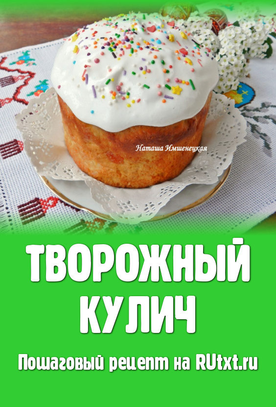 Давно хотела приготовить кулич на основе творога. В одном кулинарном журнале прочитала интересный, на мой взгляд, рецепт и приготовила творожный кулич с небольшими изменениями. Мне очень понравился такой кулич, поэтому я могу смело рекомендовать его любителям творожной выпечки. Он получился очень мягким, нежным, с явным творожным вкусом и приятным ванильным ароматом. Из указанного количества ингредиентов у меня получилось два кулича среднего размера.