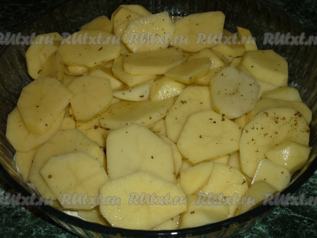Очищенный картофель режем достаточно тонкими кружками, солим, перчим, выкладываем в жаропрочную форму.