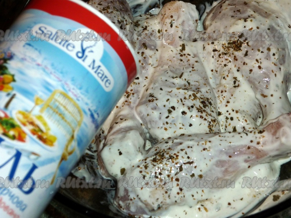 Куриные ножки солим, перчим, посыпаем сухими травами, добавляем чеснок, пропущенный через пресс, и сметану. Перемешиваем и оставляем минут на 30.