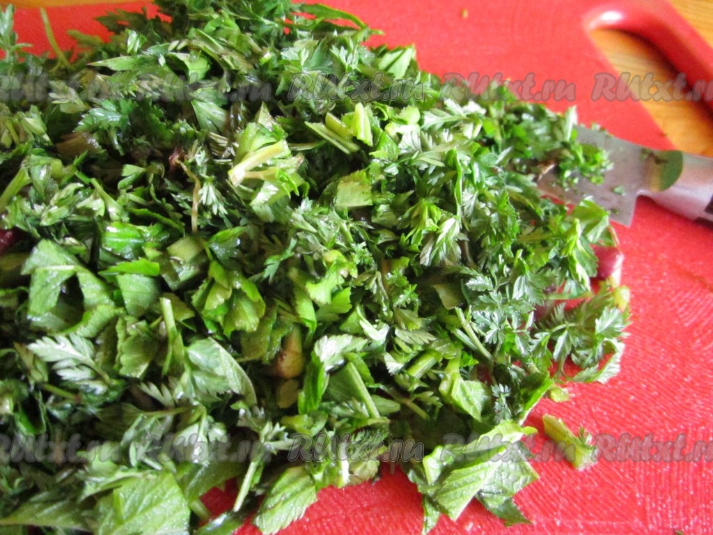 Хорошо промываем зелень, выбираем соринки и мелко-мелко режем.