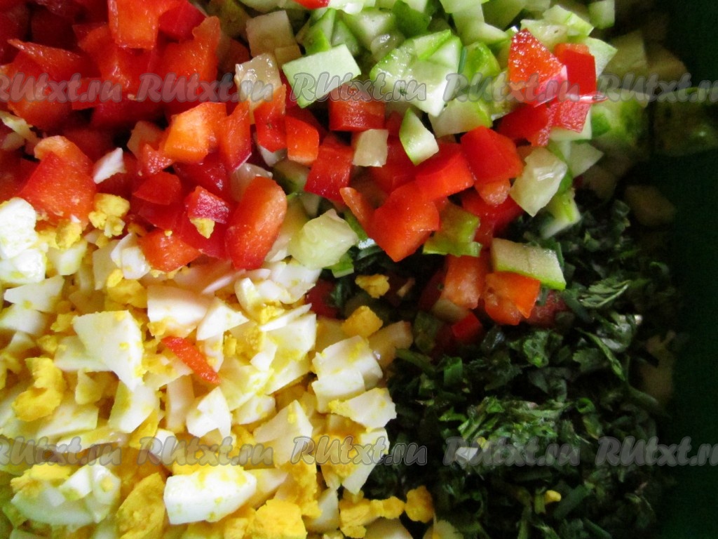 Измельчаем перец, огурец и яйца. Прибавляем к нарезанным травам.