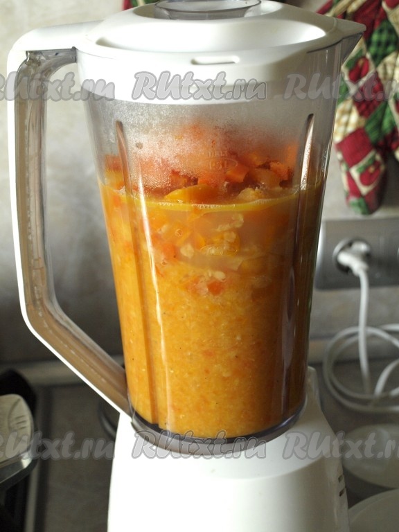 Перелить суп в блендер и пюрировать. Попробовать тыквенно-чечевичный суп-пюре и при необходимости ещё посолить и поперчить.