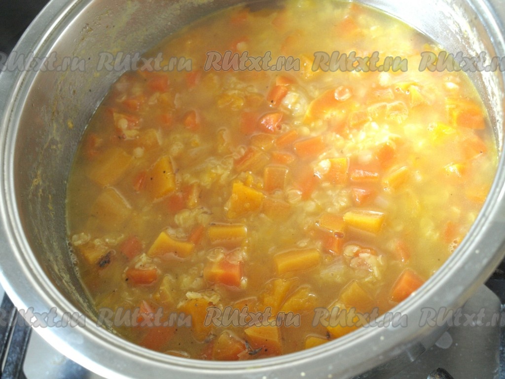 Залить содержимое кастрюли 1,5 литрами горячей воды, дать закипеть, а затем варить постный суп из тыквы и чечевицы на медленном огне 25-30 минут (до готовности чечевицы). За 10 минут до окончания варки в суп следует добавить соль.