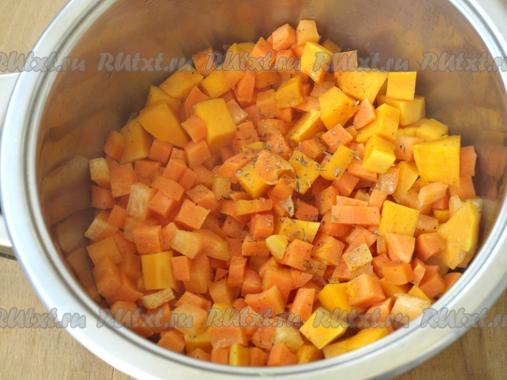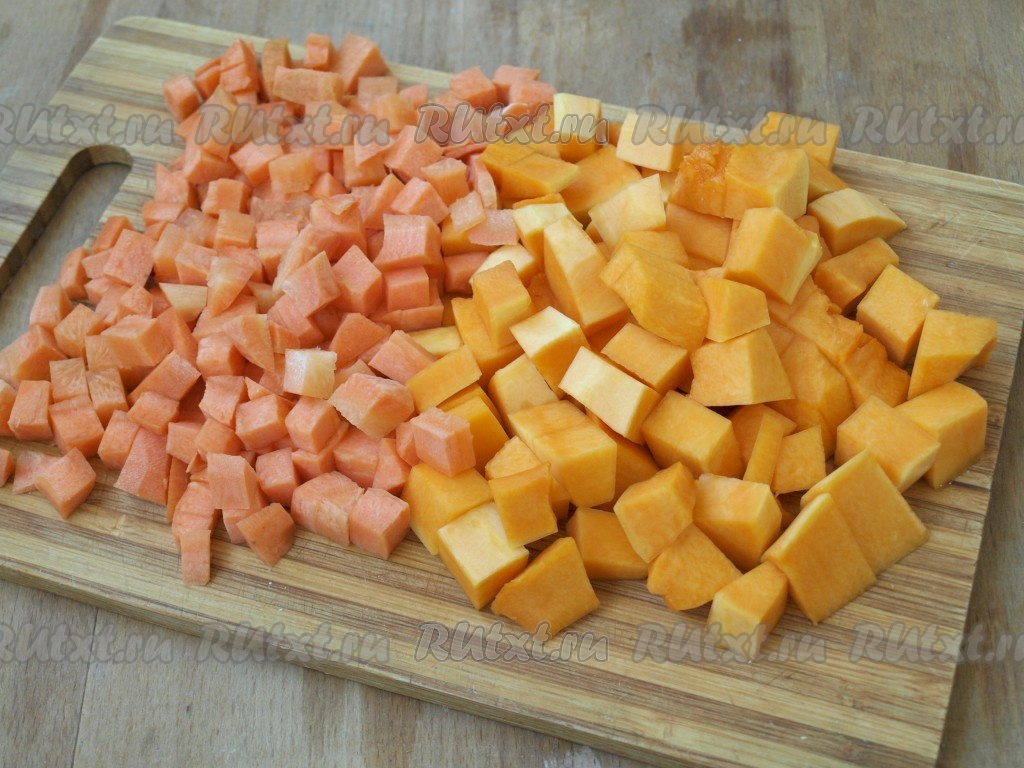 Очищенные тыкву и морковь нарезать на небольшие кубики.