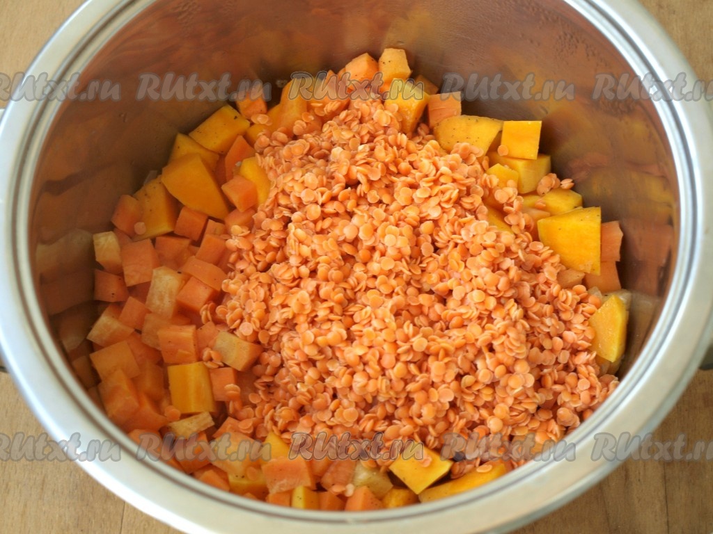 Затем добавить в кастрюлю промытую красную чечевицу.