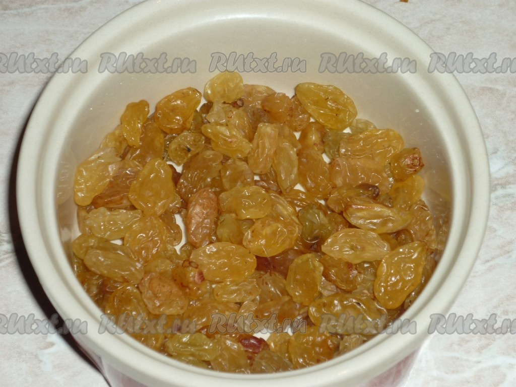 Изюм залить горячей водой на 15 минут. Затем воду слить, а изюм обсушить.