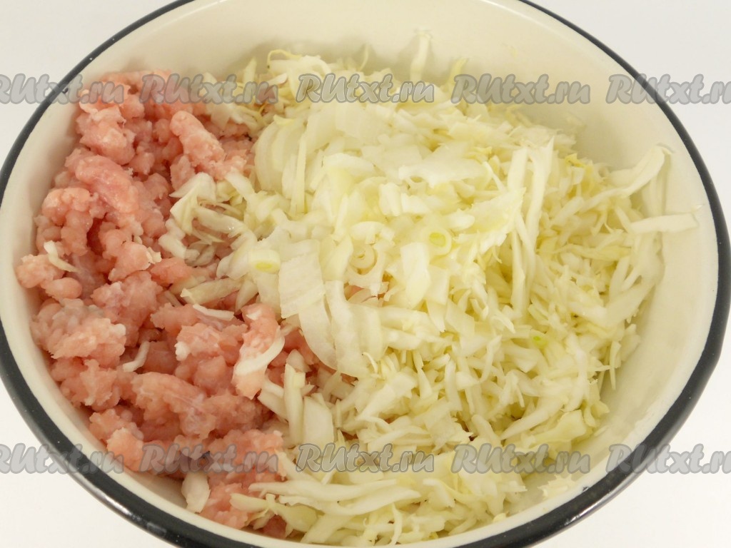 Капусту тонко нашинковать, посолить и хорошо помять руками, лук мелко нарезать. Добавить капусту и лук к фаршу.