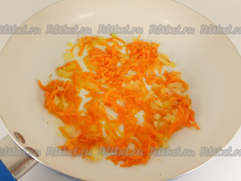 Лук нарезать, морковь натереть на крупной терке и обжарить до мягкости на растительном масле.