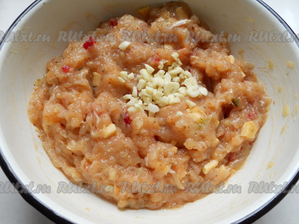 Тщательно фарш перемешать. Чеснок мелко нарезать, добавить в фарш и снова хорошенько перемешать.