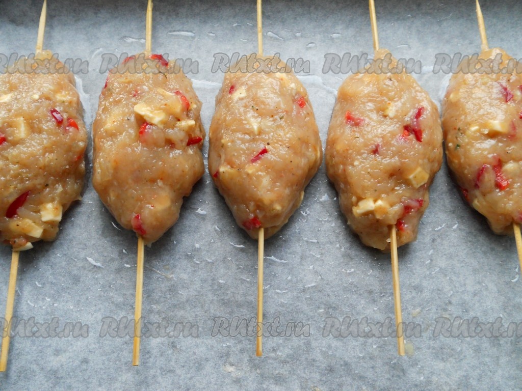 Противень застелить пергаментом (или фольгой), смазать растительным маслом. Деревянные шпажки замочить на 10 минут в воде. Из подготовленного фарша сформировать продолговатые котлеты, нанизать их на шпажки. Выложить на противень.