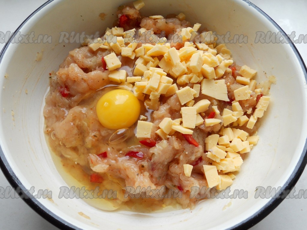 Затем к получившемуся фаршу вбить сырое яйцо, по желанию, добавить твёрдый сыр, нарезанный на мелкие кубики.