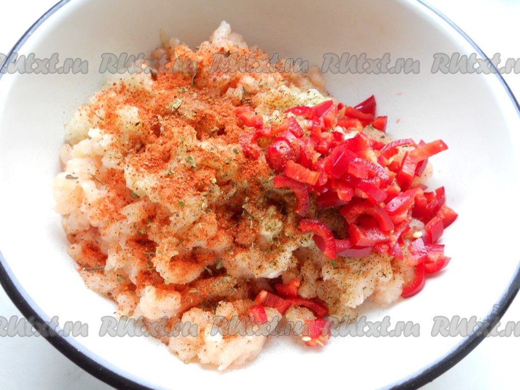 Лук и чеснок очистить. Из болгарского перца убрать семена. Мясо (у меня - куриное филе, но можно взять и, например, свинину или индейку) промыть, обсушить, пропустить через мясорубку вместе с луком, посолить, приправить специями (в качестве специй я добавила смесь перцев, 1 чайную ложку хмели-сунели и 1 чайную ложку паприки), по желанию, можно добавить болгарский перец, нарезанный тонкой соломкой, перемешать.