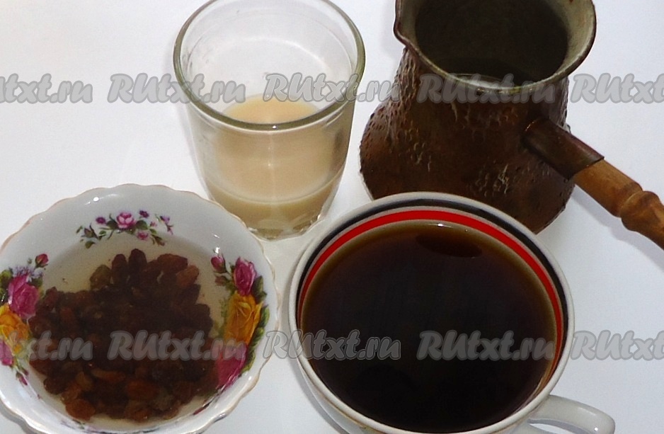 Сварить кофе, остудить, изюм залить кипятком на 15 минут, в небольшом количестве воды растворить дрожжи с 1 чайной ложкой сахара и дать подняться.