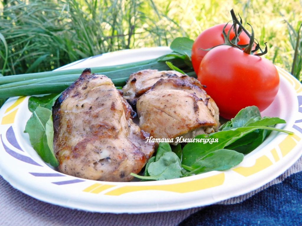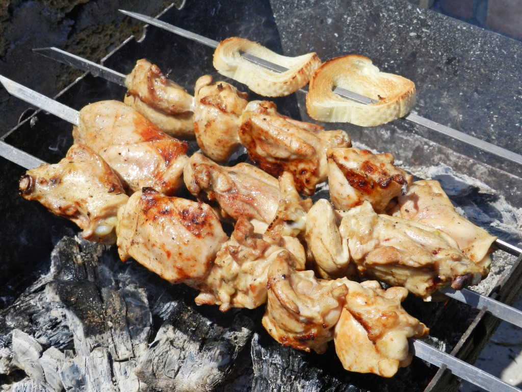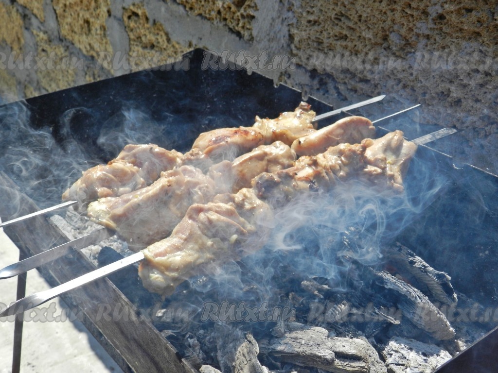 Кусочки курицы нанизывать на шампуры и жарить шашлык на мангале над раскалёнными углями традиционным способом.