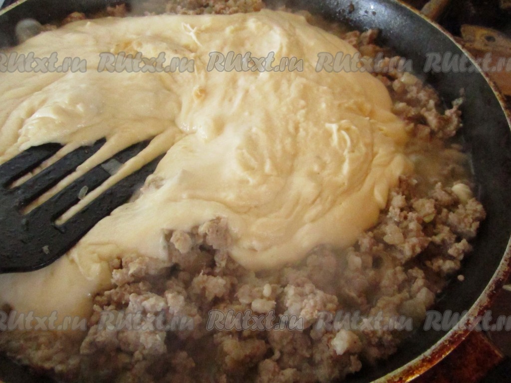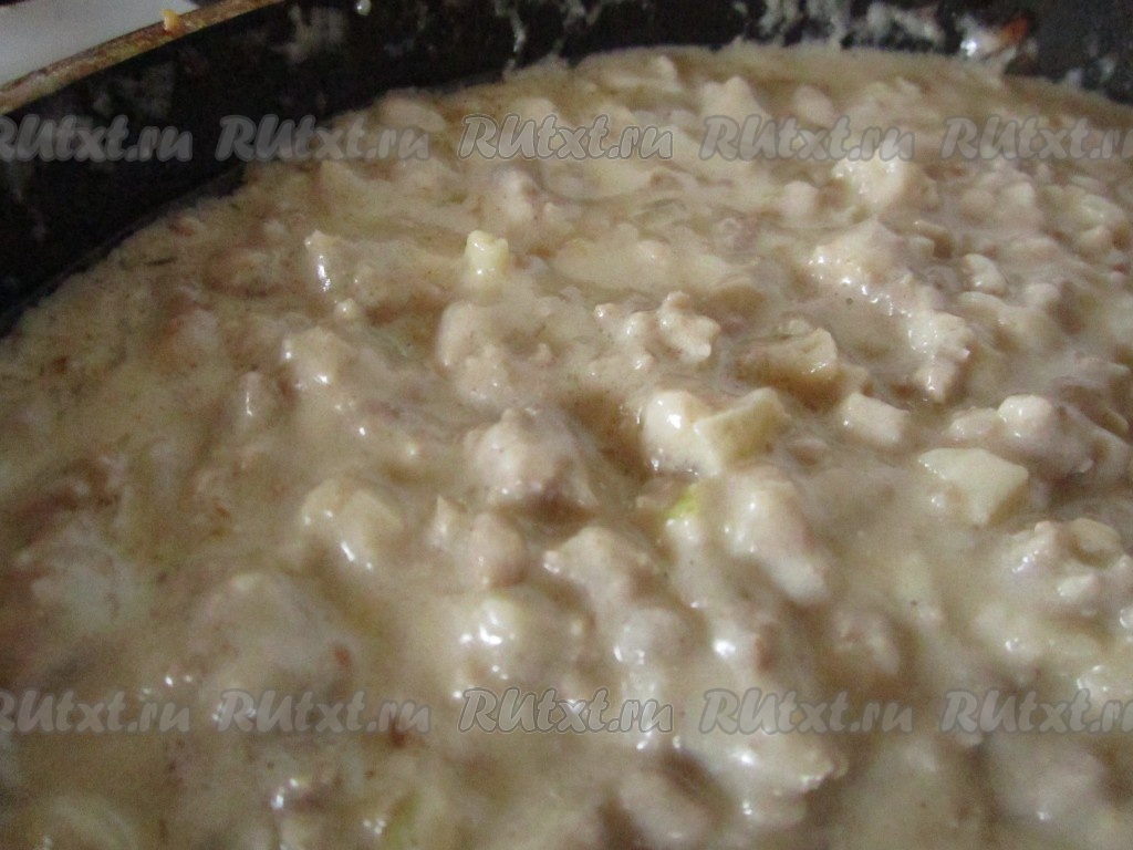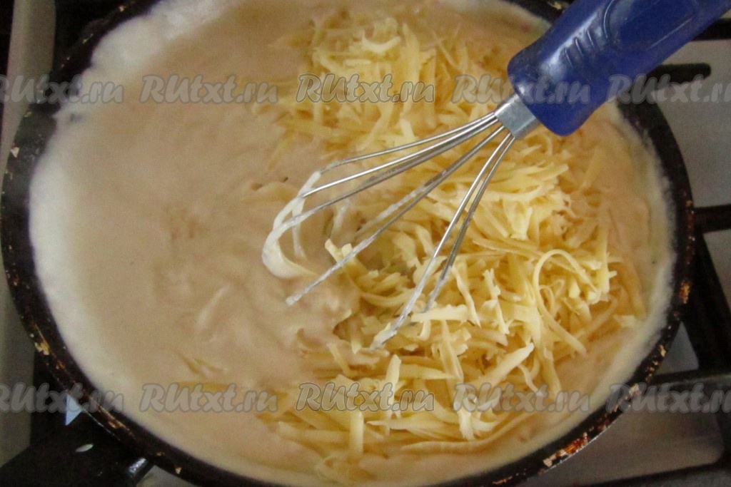 Доведите заправку до кипения, постоянно помешивая. В кипящую заправку понемногу кладите тёртый сыр, размешивая каждую порцию, пока сыр полностью не растает. Должен получиться довольно-таки густой соус. Он станет немного более жидким за счёт бульона, образовавшегося при тушении фарша.