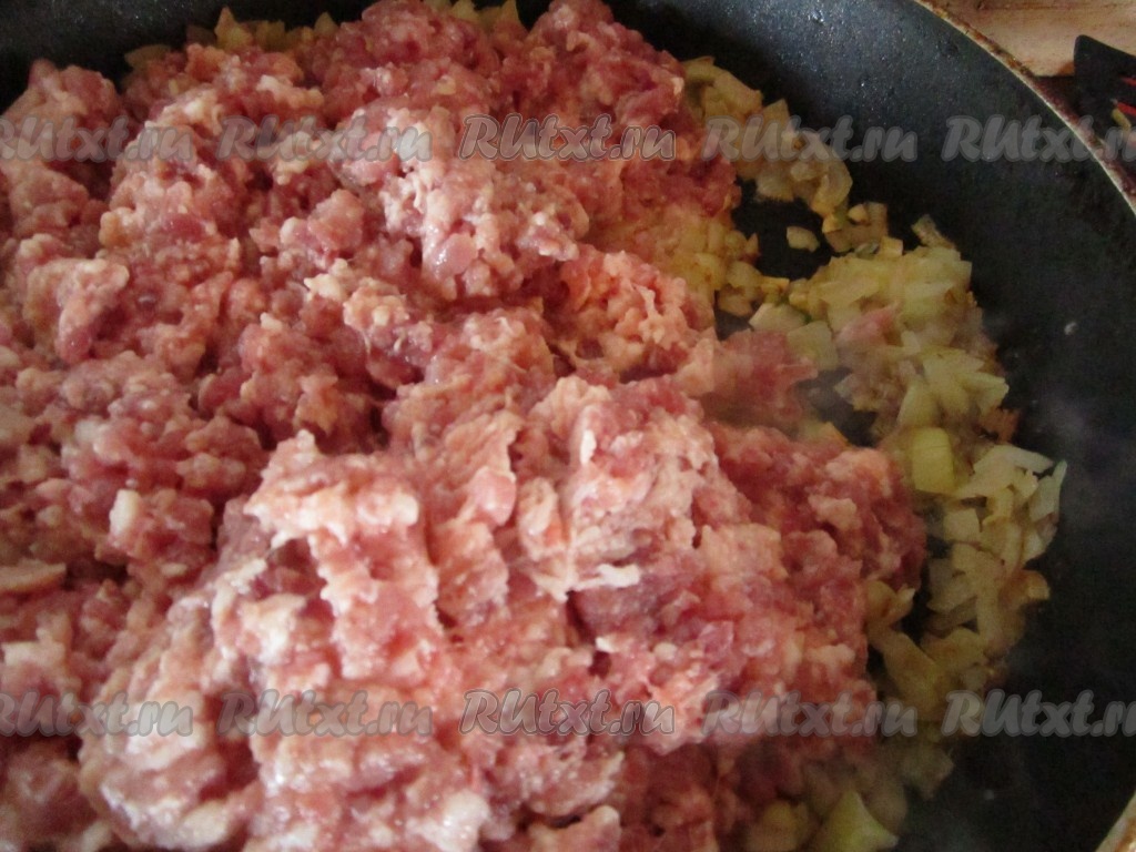 Добавьте к обжаренным луку и чесноку фарш. Посолите и приправьте фарш по Вашему вкусу. Тушите всё на небольшом огне, время от времени помешивая, около 30 минут.