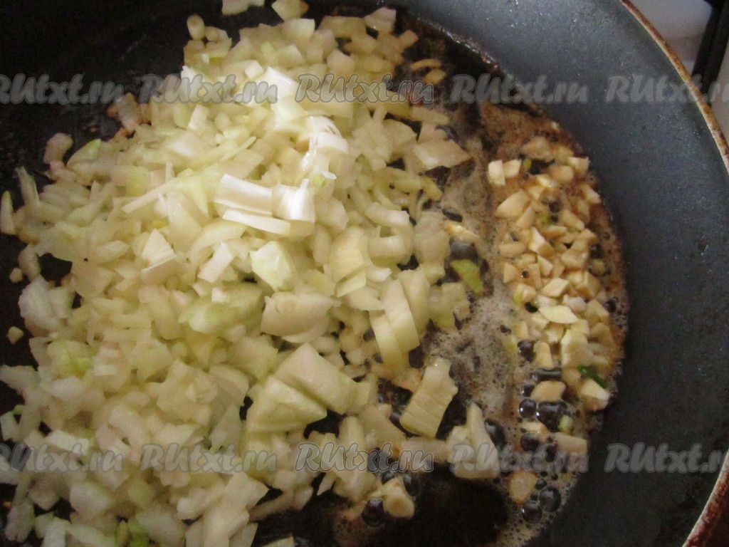 В глубокой сковороде растопите ложку сливочного масла и немного обжарьте на нём измельчённые лук и чеснок.