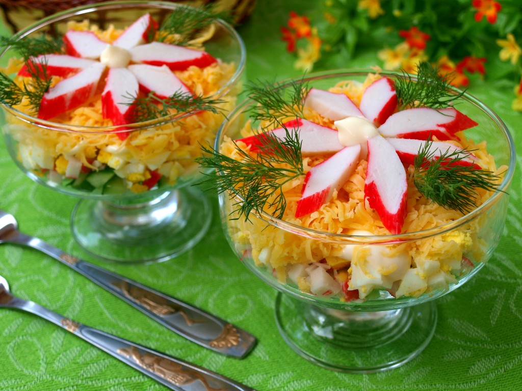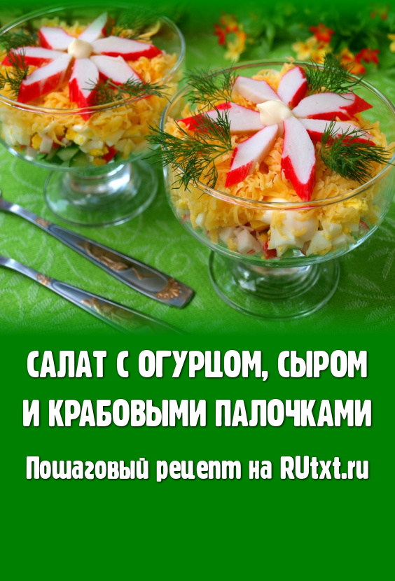 Предлагаю вам приготовить вкусный порционный салат в сочетании крабовых палочек, свежего огурца и сыра. Такой салат выкладывается в креманки слоями и несомненно украсит любой праздничный стол. Обязательно попробуйте!