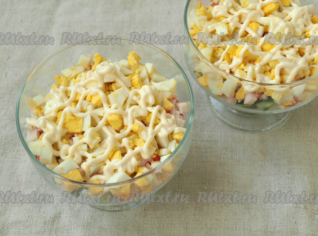 Выложить их слоем поверх крабовых палочек и смазать майонезом.