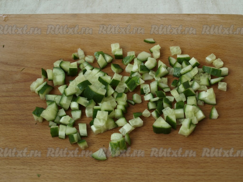 Нарезать кубиками свежий огурец.
