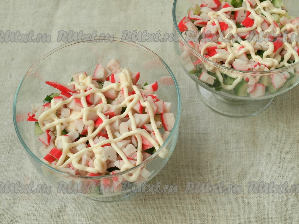 Крабовые палочки также мелко нарезать. Выложить следующим слоем и снова нанести майонез.
