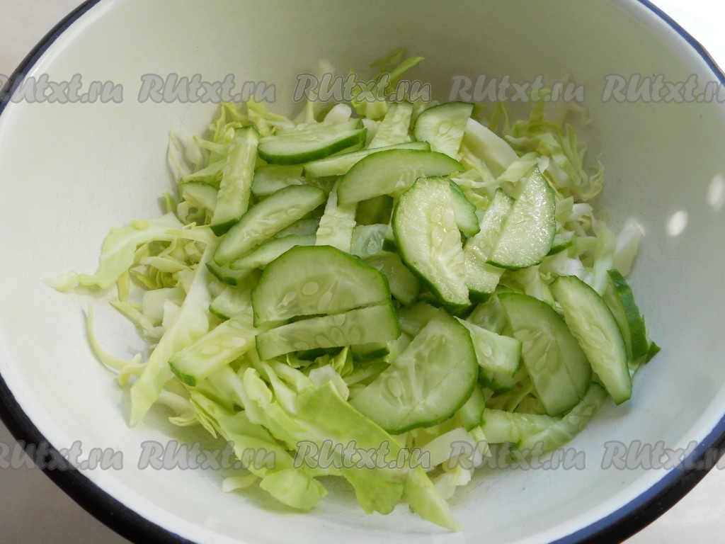 Капусту тонко нашинковать, добавить порезанный небольшими кусочками свежий огурчик.