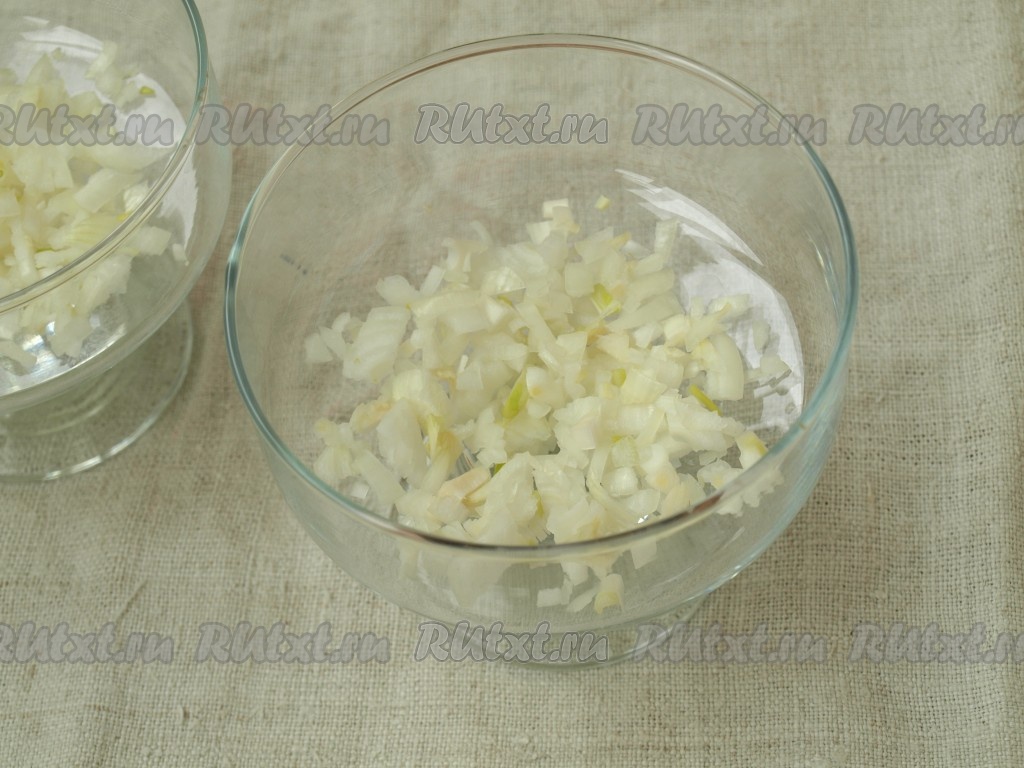 Нарезать кубиками репчатый лук и выложить его на дно порционных креманок.