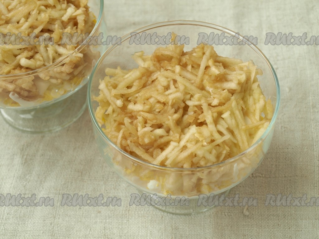 Яблоко натереть на тёрке, сбрызнуть лимонным соком. Яйца смазать майонезом и выложить яблоки.