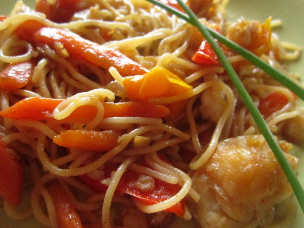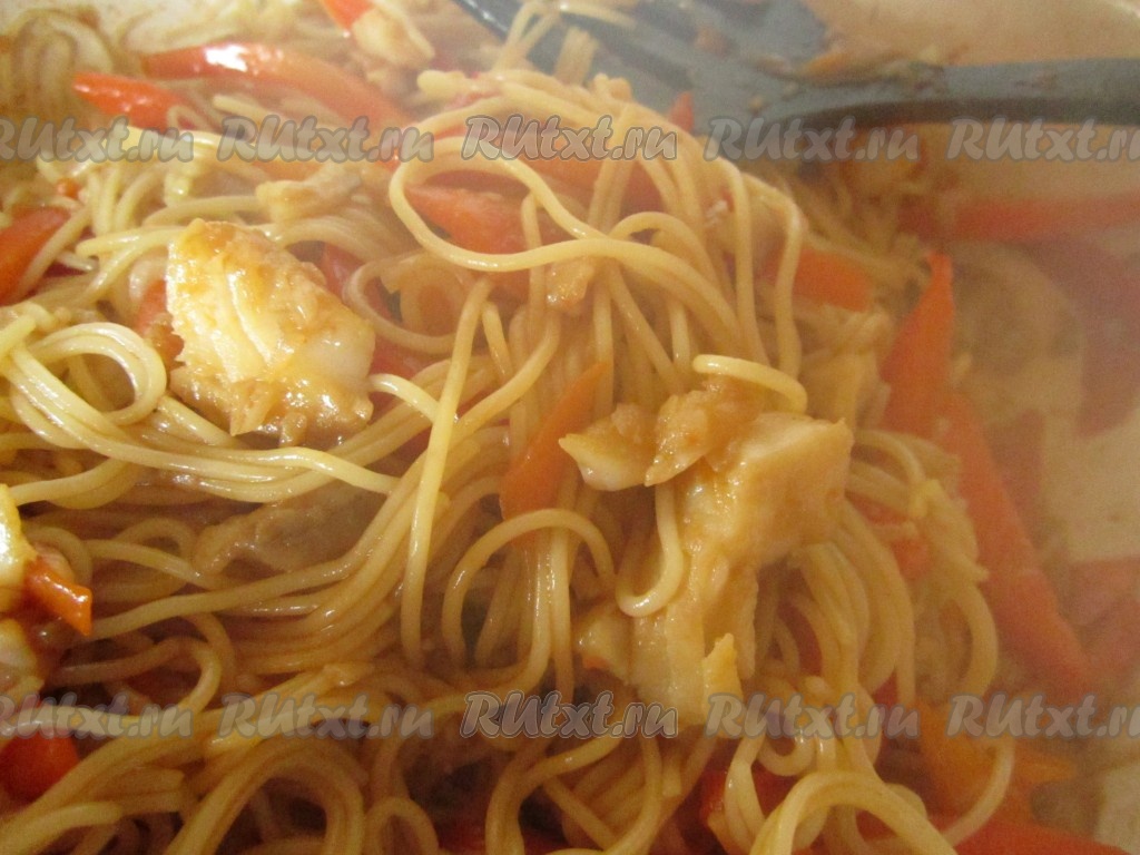 Добавьте к рыбе и овощам отваренную лапшу, хорошо перемешайте и обжаривайте её с соусом ещё немного на большом огне. Лапшу нужно постоянно мешать.