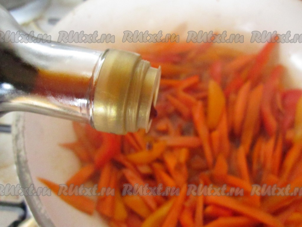 Морковь и перец нарежьте длинными перьями. В сковороде с круглым дном разогрейте на большом огне масло. Всыпьте в сковороду овощи. Щедро приправьте соусом "Терияки".
