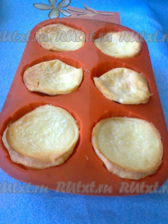 Смажьте растительным маслом 6 силиконовых форм для кексов и 6 металлических форм для корзиночек (или 12 форм по своему усмотрению). Булочек получается 12 штук. Поставьте пустые формочки на пару минут в разогретую духовку для подогрева. Заполните тёплые формочки тестом наполовину.