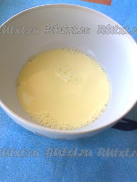 Разбейте в миске яйца и оставьте, чтобы они согрелись до комнатной температуры. Вскипятите молоко и оставьте, чтобы оно остыло до комнатной температуры. Растопите сливочное масло (можно в микроволновке), дайте немного остыть. Включите разогреваться духовку до 230 градусов. В глубокой миске перемешайте яйца с молоком.