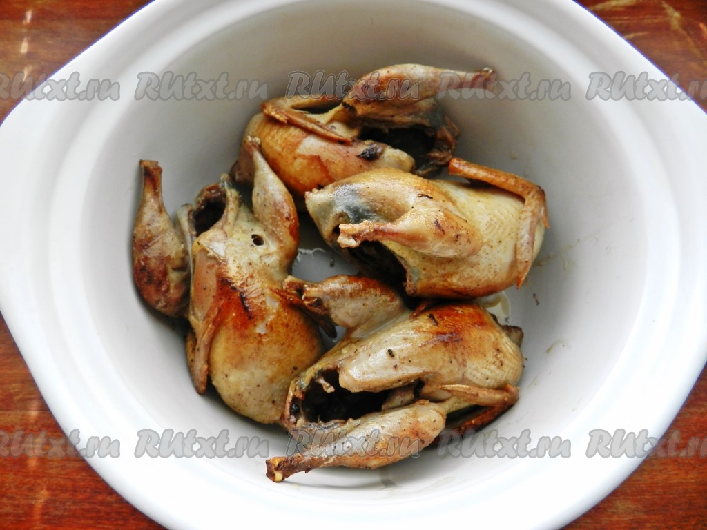 Затем обжарить перепелов в сковороде на оставшемся растительном масле до золотистого цвета. Обжаренных перепелов переложить в толстостенную кастрюлю.