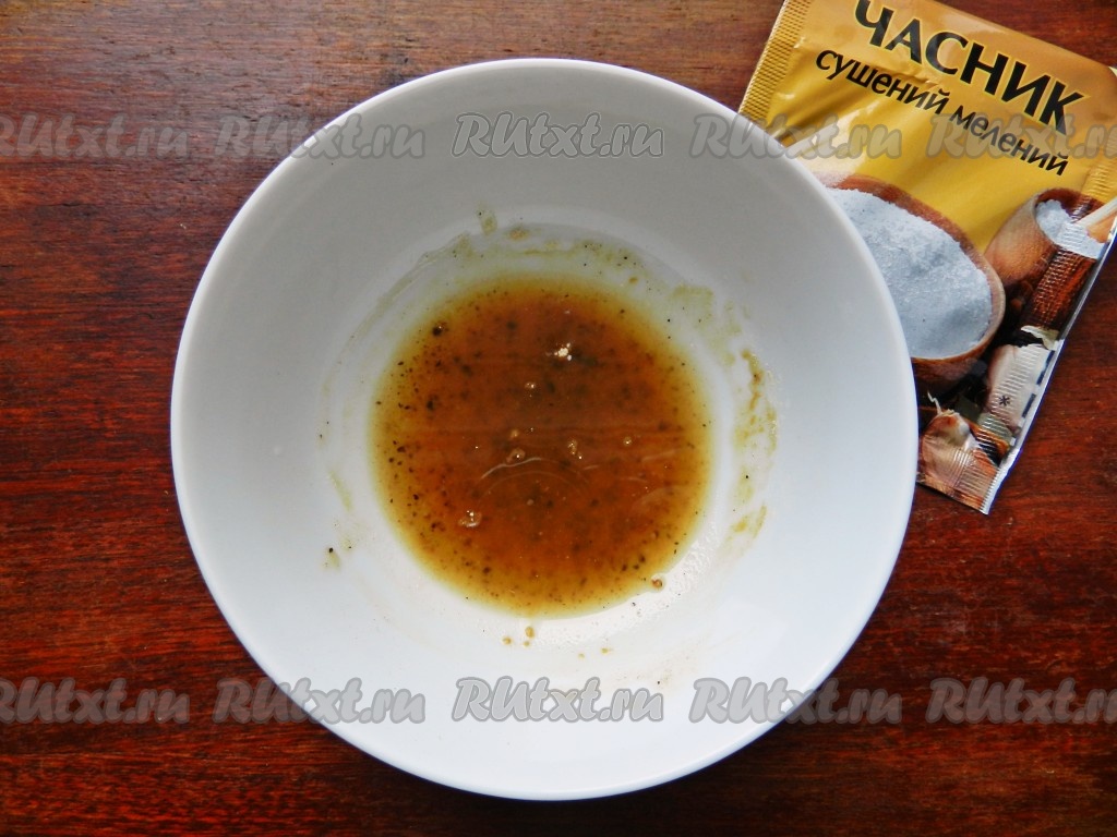 Смешать соль, перец, сушеный чеснок и 1 столовую ложку растительного масла в однородную массу.