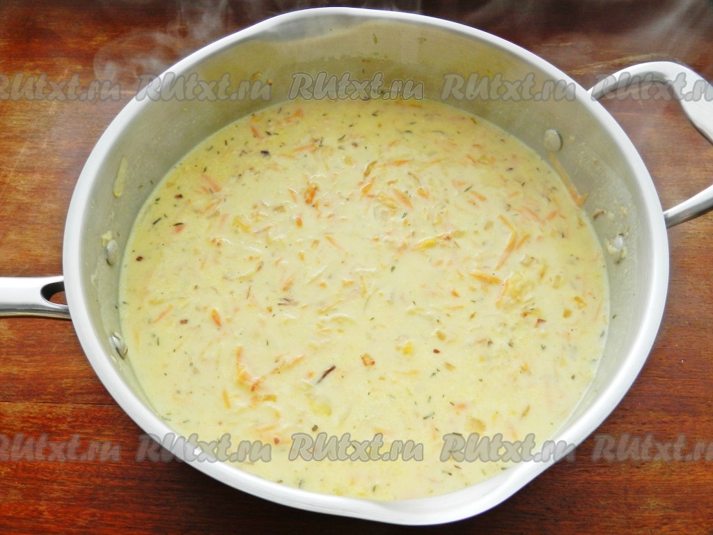Добавить муку, быстро перемешать, чтобы мука равномерно распределилась и обжарилась. Влить горячий бульон, добавить сметану, сухой тимьян. Довести до кипения.