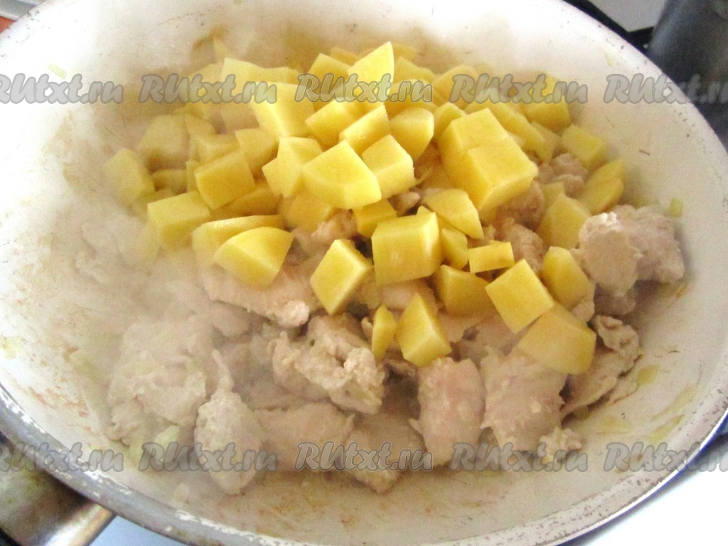 Картофель очистите и нарежьте крупными кубиками. Добавьте к обжаренной курице с луком. Перемешайте.
