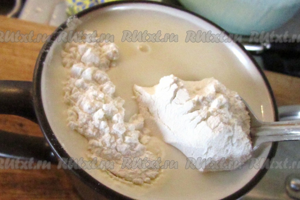 Тем временем разболтайте в оставшемся молоке или сливках кукурузный крахмал (за неимением можно заменить обычной мукой, но с крахмалом вкус будет нежнее. Картофельный крахмал не подходит, он даёт другую, тягучую консистенцию).