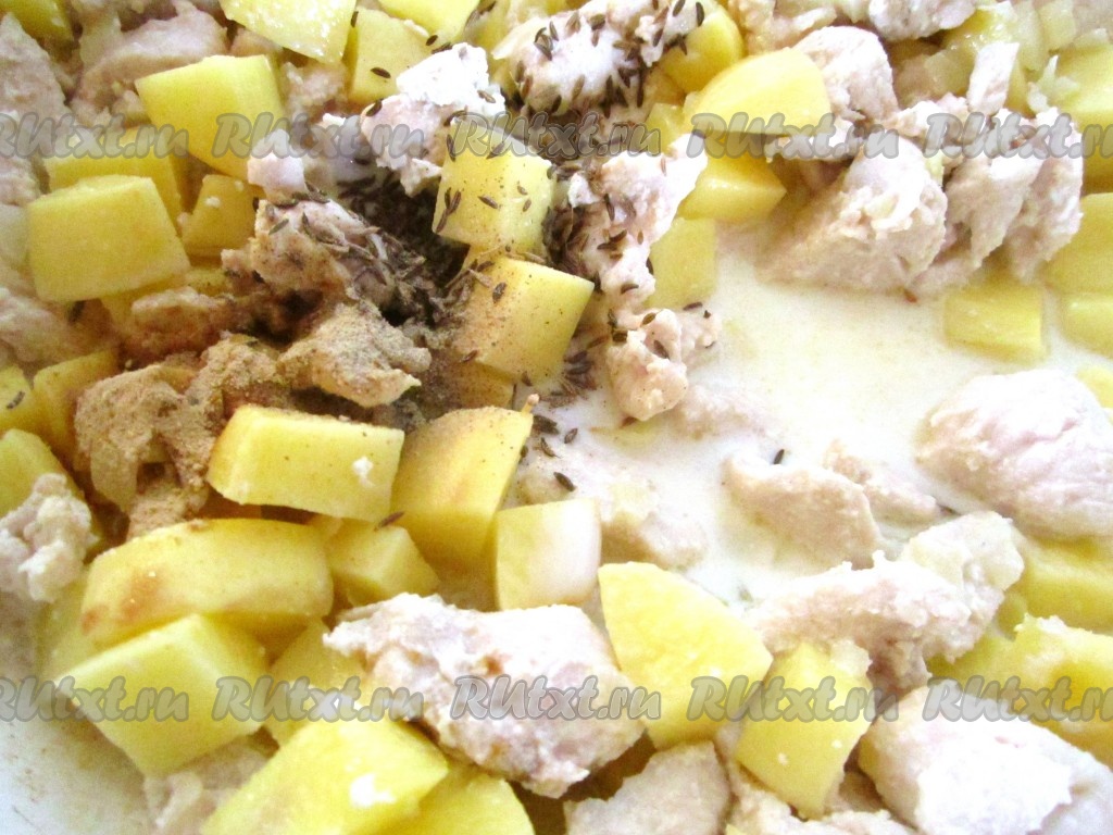 Посолите по вкусу и приправьте тмином, зирой, белым перцем и сушёным имбирём. Влейте в сотейник 2/3 стакана молока или сливок. Тушите рагу на небольшом огне под крышкой около 15 минут.