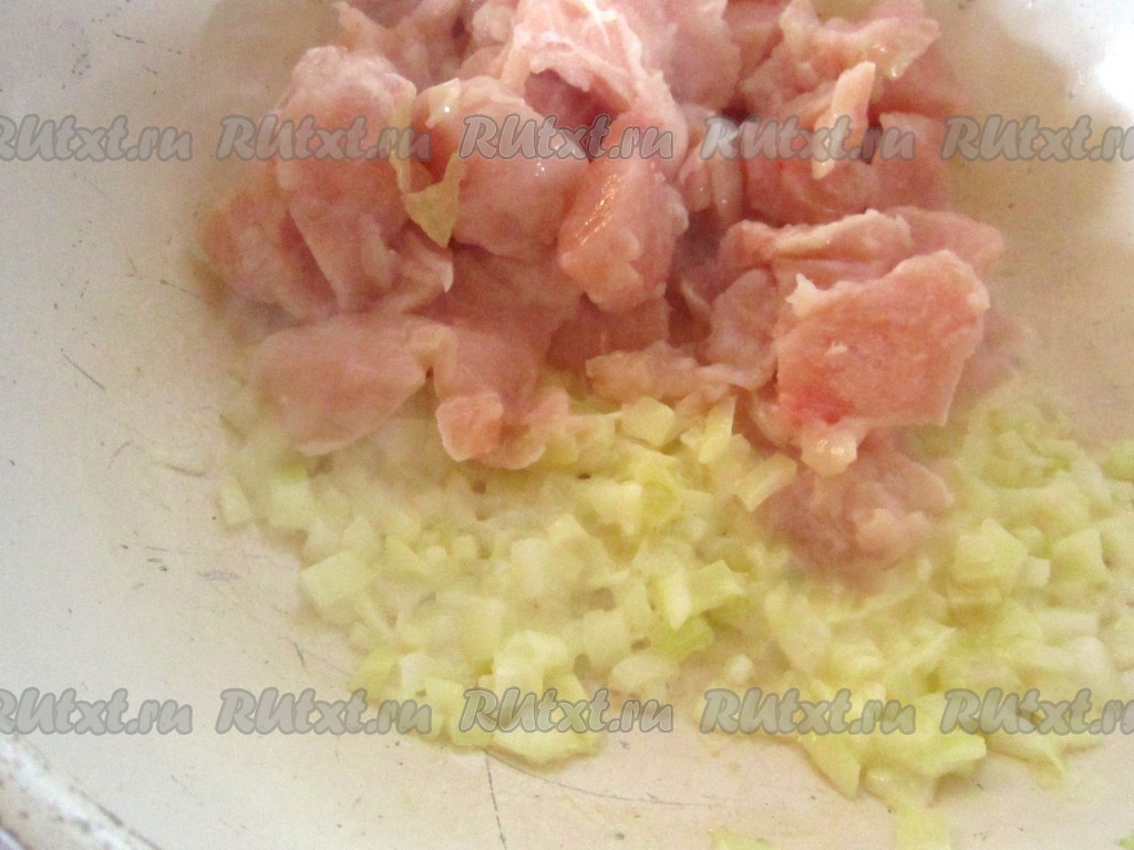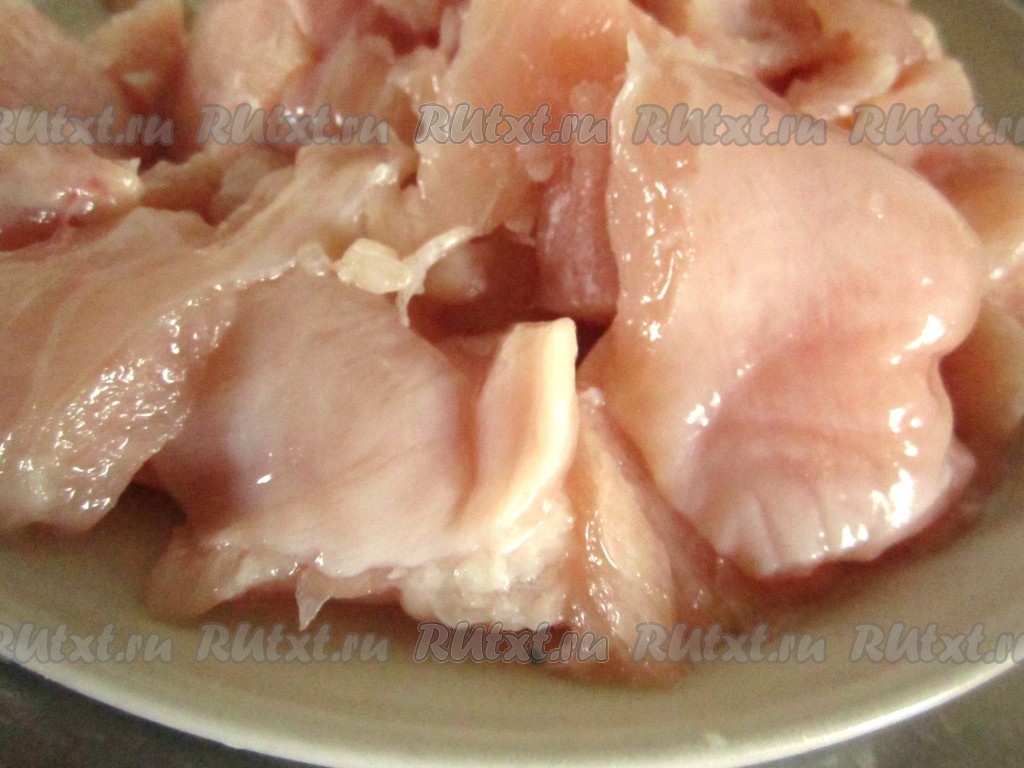 Филе куриной грудки нарежьте небольшими кусочками.