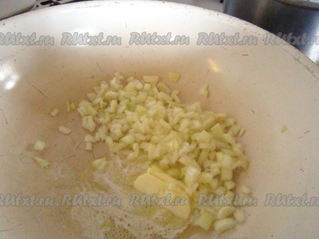 Луковицу очистите и мелко нарежьте. В сотейнике растопите сливочное масло и немного потомите в нём репчатый лук.