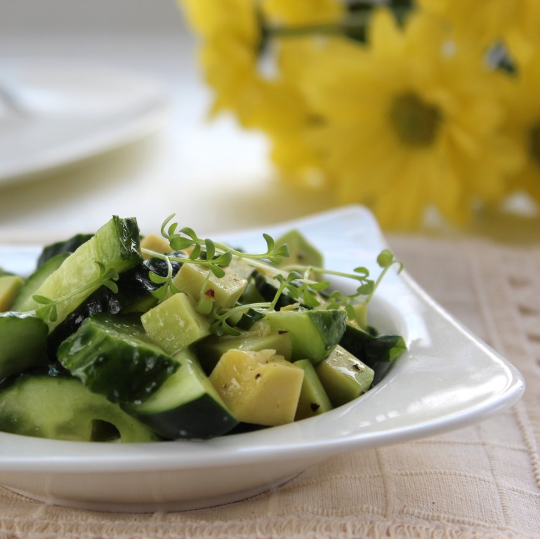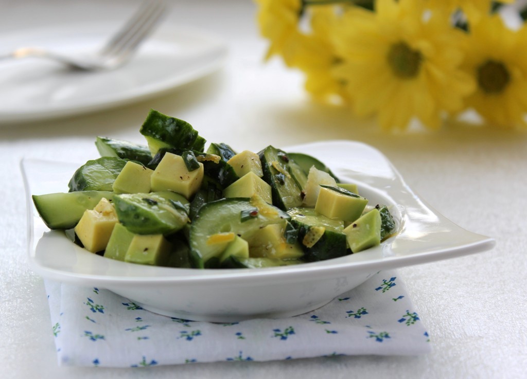Выложить в салатник и подать к столу. Вот так за считанные минуты можно приготовить лёгкий, с нежной кислинкой салат с огурцами и авокадо.