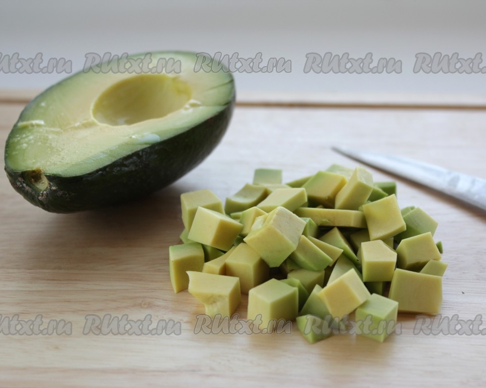 Из авокадо удалить косточку, очистить от шкурки и нарезать кубиками, сбрызнуть лимонным соком (лимонный сок не даст авокадо потемнеть).